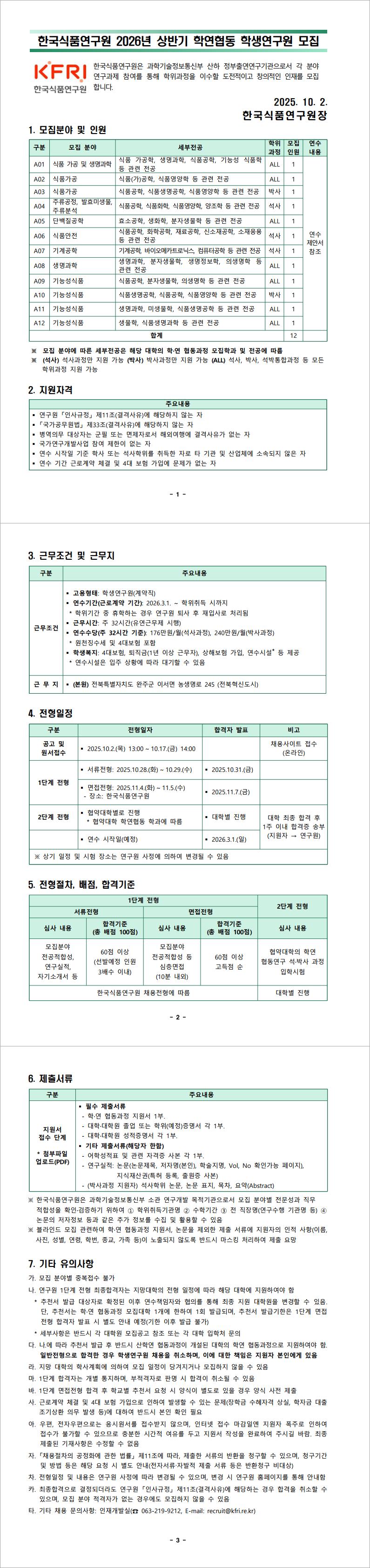 또한, 지원서 작성 시 대학교에 연락하여 한국식품연구원과 학연과정 운영 여부 및 2026년 상반기 수요 여부를 확인 바랍니다.
