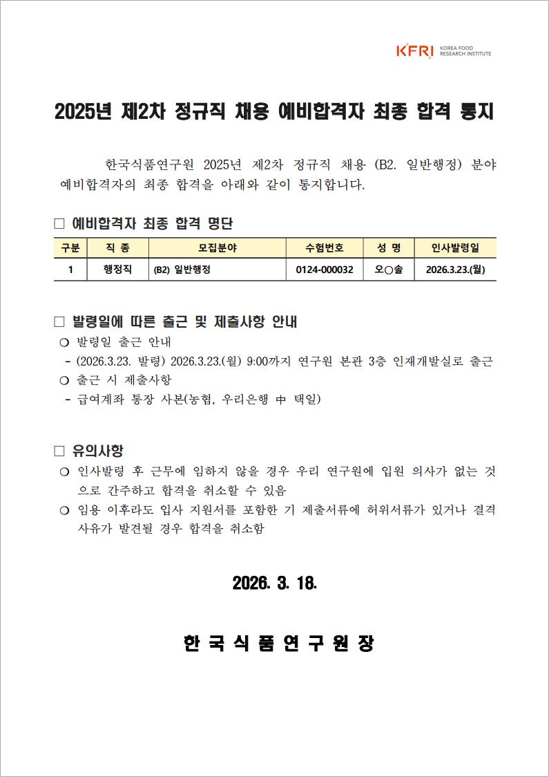 2025년 제2차 정규직 채용 행정직(일반행정) 분야 예비합격자 최종 합격을 알려드립니다.
